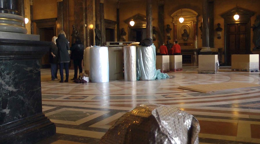 Sochy, sejmuté ze soklů, čekají v Pantheonu na transport.