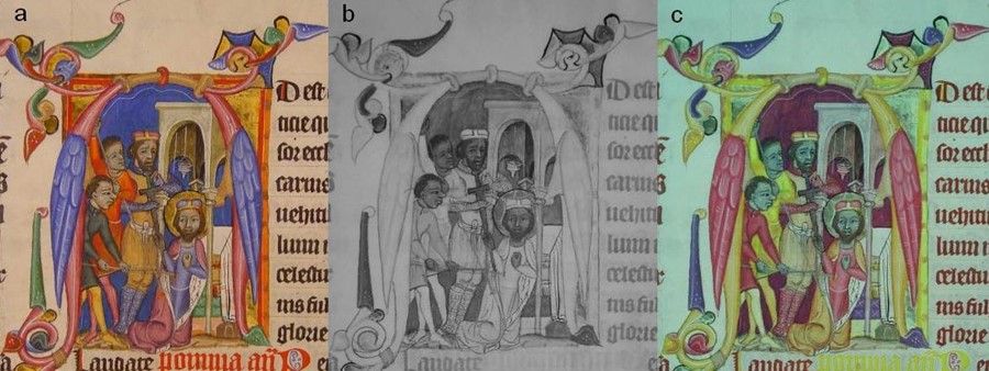 Zavraždění sv. Václava v iniciále A na VIS snímku (vlevo), IR snímku (uprostřed) a IR snímku ve falešných barvách (vpravo), celek