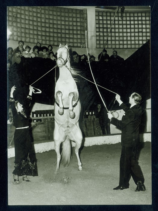 Duo Doubek – Pavel a Milena Doubkovi – v cvičné manéži při představení pro zaměstnance zimoviště (v rámci přípravy na přehrávky), po r. 1976