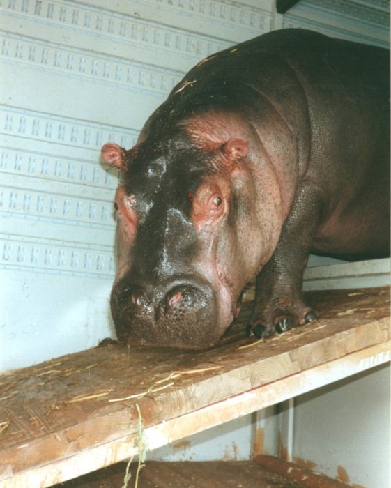 Hroch Davídek drezérky Olgy Ringelové sestupuje z transportního boxu, fotografie z roku 1992