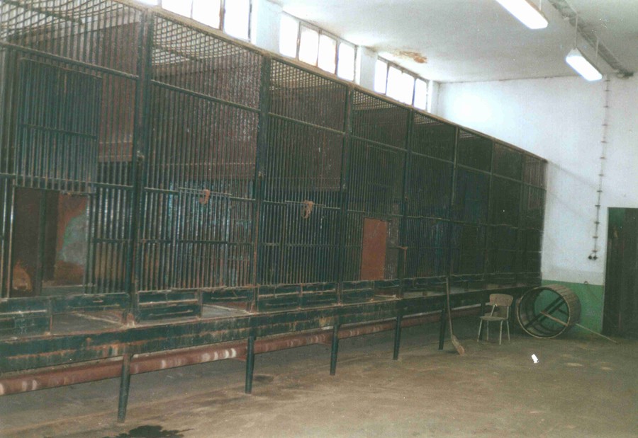 Opuštěné klece pro šelmy v ubytovací hale pro cizokrajná zvířata, postaveno v 70. letech 20. století, foto 1992 při předání objektu Národnímu muzeu
