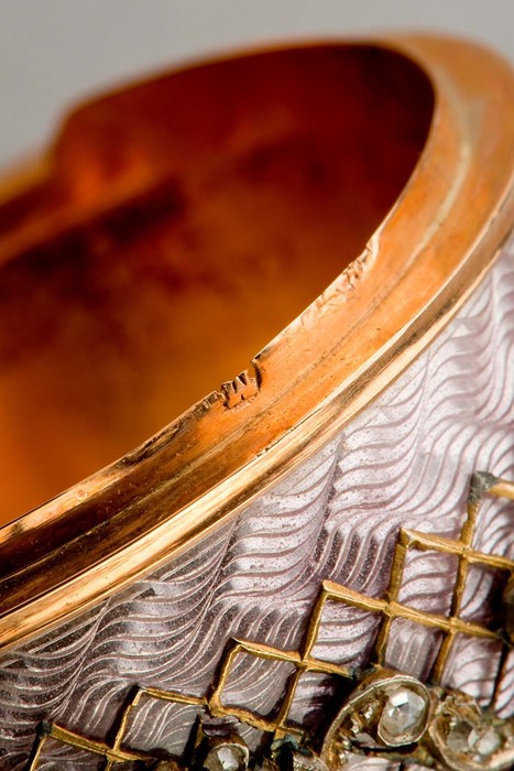 Pravděpodobně novodobá kopie Fabergého vejce - detail se značkou Fabergé v azbuce