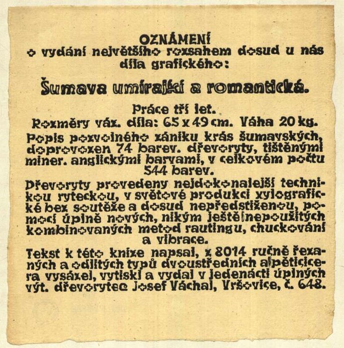Reklamní prospekt Josefa Váchala – oznámení vydání Váchalovy Šumavy umírající a romantické, 1931.