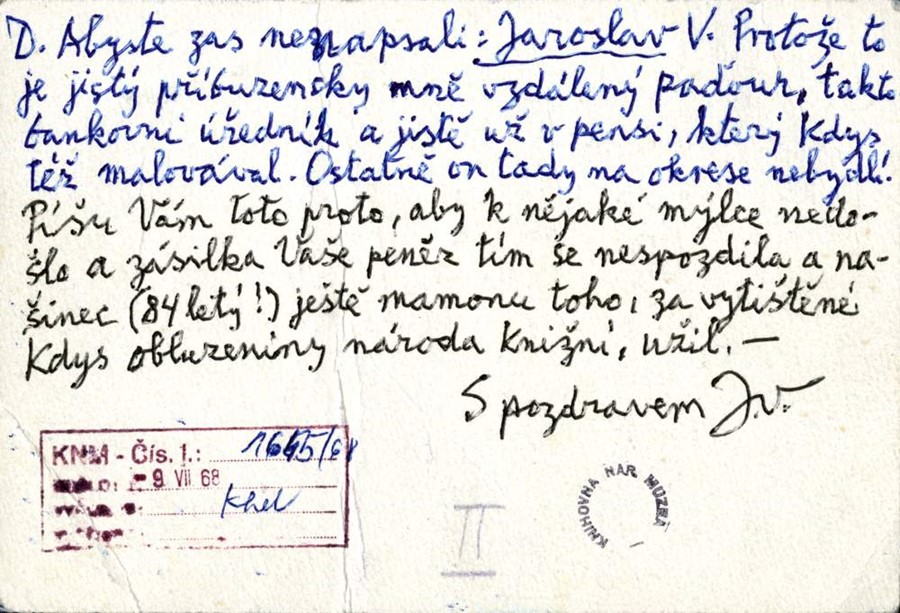 Dopis Josefa Váchala z 3. července 1968, ve kterém vyjadřuje poděkování za nákup jeho pěti autorských knih do sbírek Knihovny Národního muzea, a sděluje, kam mají být peníze z prodeje knih zaslány.