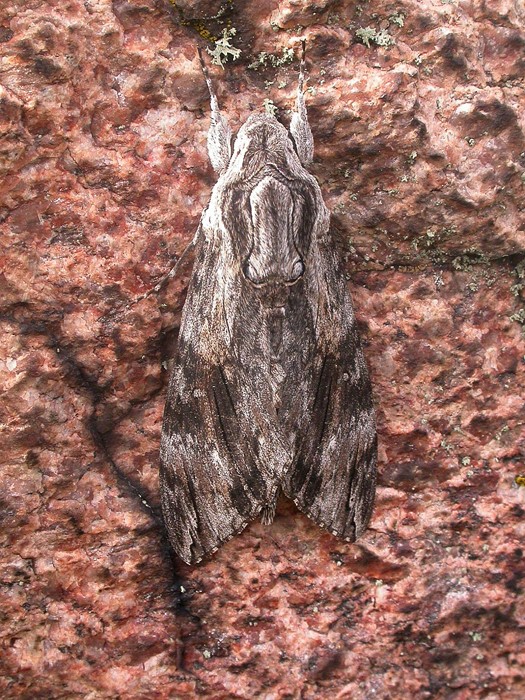 Tropický lišaj svlačcový [Agrius convolvuli (Linnaeus, 1758)] je pravidelným návštěvníkem Podyjí z jižních zemích. Na snímku jedinec pozorovaný v září roku 2009 na Fládnitzkém vřesovišti.