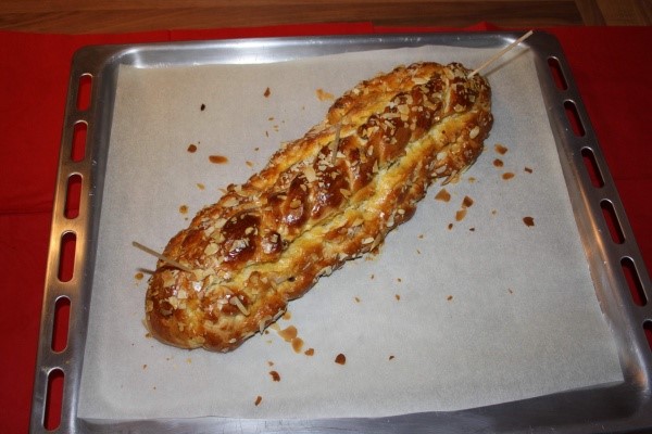 Vánočku necháme na plechu ještě asi 15 až 20 minut kynout. Pak ji potřeme rozšlehaným vejcem a posypeme mandlemi. Aby se nám prameny nesvezly, můžeme vánočku propíchat na několika místech špejlemi.