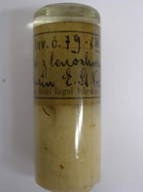 Epruveta (malá skleněná nádobka s rovným dnem, uzavřená smotkem vaty) s klíštětem