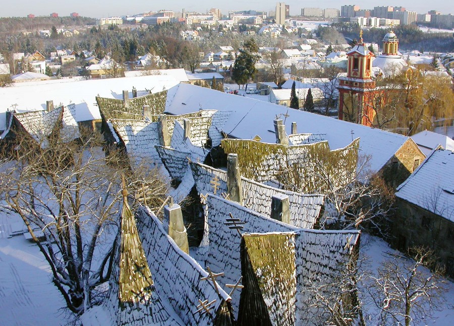 Pohled do hospodářského dvora se stavbami z filmu Van Helsing