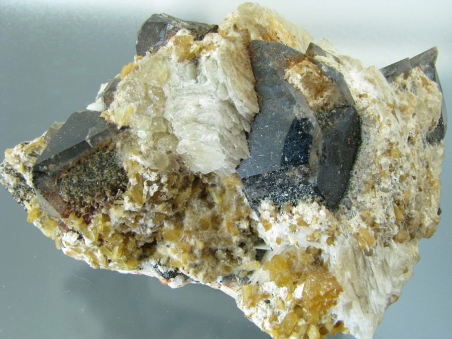 Křemen – záhněda se stilbitem ze Strzegomi v Polsku (8 × 5 cm) ze sbírky O. Settmachera