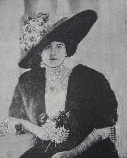 Dáma v klobouku zdobeném svazkem růží ze stínovaného sametu a kožešinou činčily, 1909-1910.