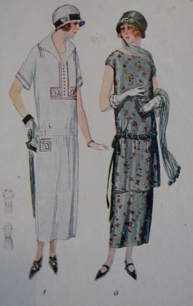 Večerní toalety z imprimé krepdešínu, model Molyneux Paříž, 1934.