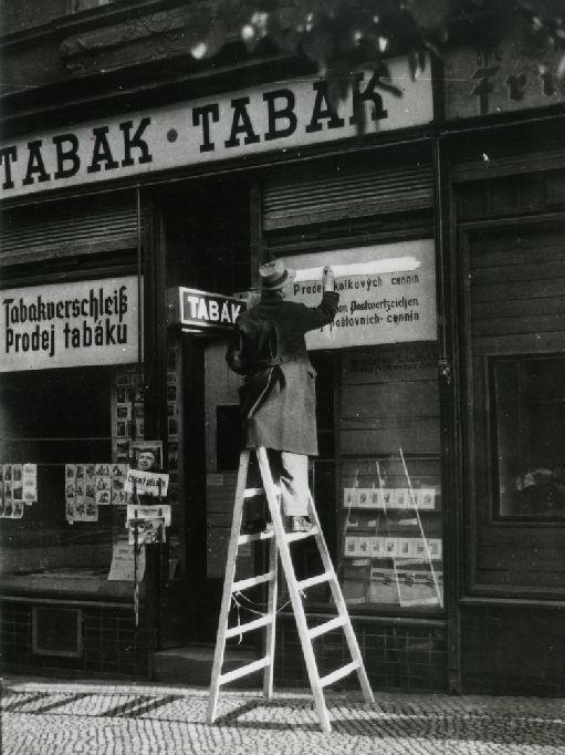 Odstraňování německých nápisů v Praze. 4. 5. 1945