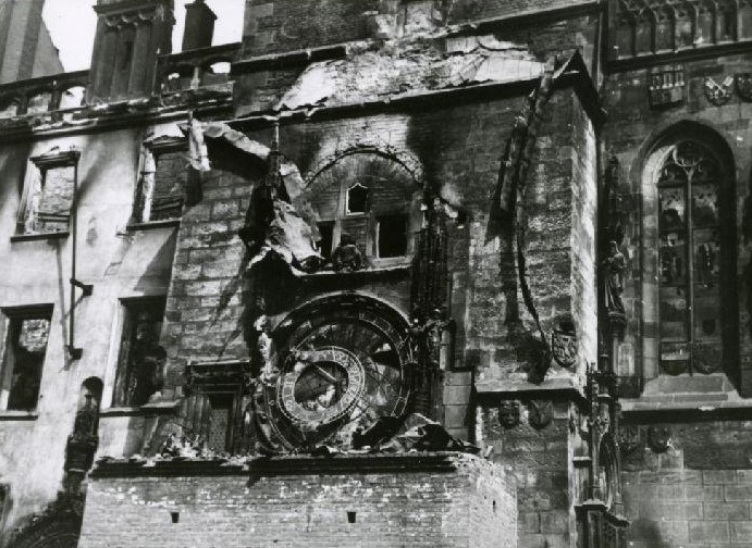 Celé Staroměstské náměstí bylo zničeno po několika německých útocích a jen díky obětavé práci pražských dobrovolníků se podařilo zabránit ještě větším škodám. 8. 5. 1945