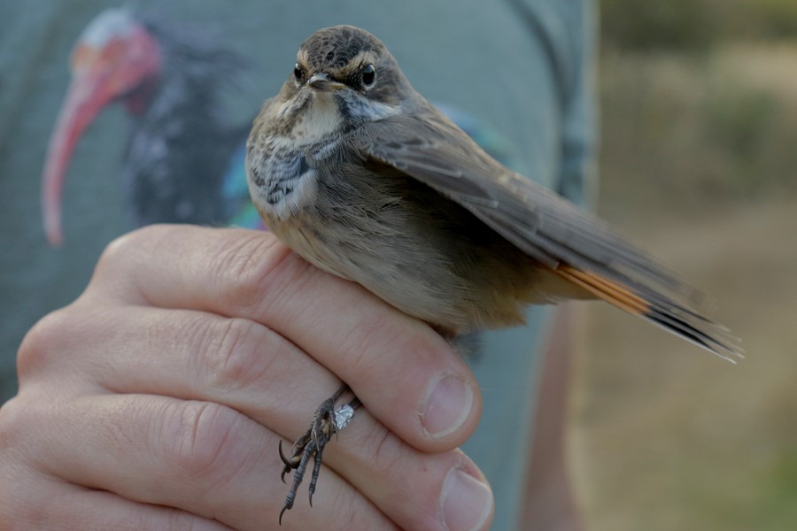 Někdy se během odchytu podaří i nečekaný úlovek - v tomto případě mladý slavík modráček. Zdroj: Národní muzeum