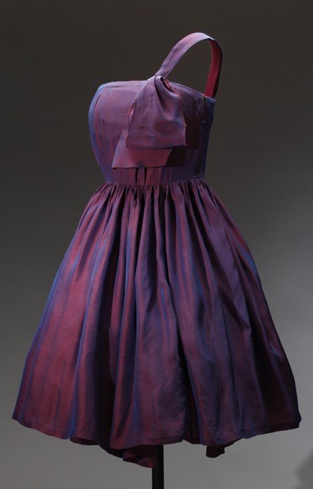 Šaty fialové společenské, šité doma, syntetický taft, 1962.