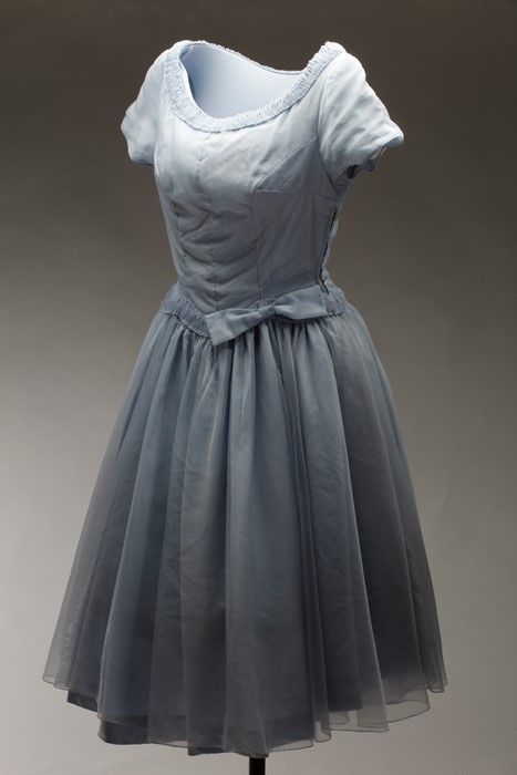 Šaty pro družičku blankytně modré, silon, polyamidové vlákno typu 6, krejčová paní Medlová, neurčený bratislavský módní salon, 1961–1962