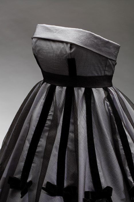 Šaty dámské společenské v barvě holubičí šedi se sametovými dekoracemi, polyesterový šifon, Le Palais Vintage, 2016. Šaty jsou inspirovány reálnými šaty monacké kněžny Grace Kelly. (Retrošaty)