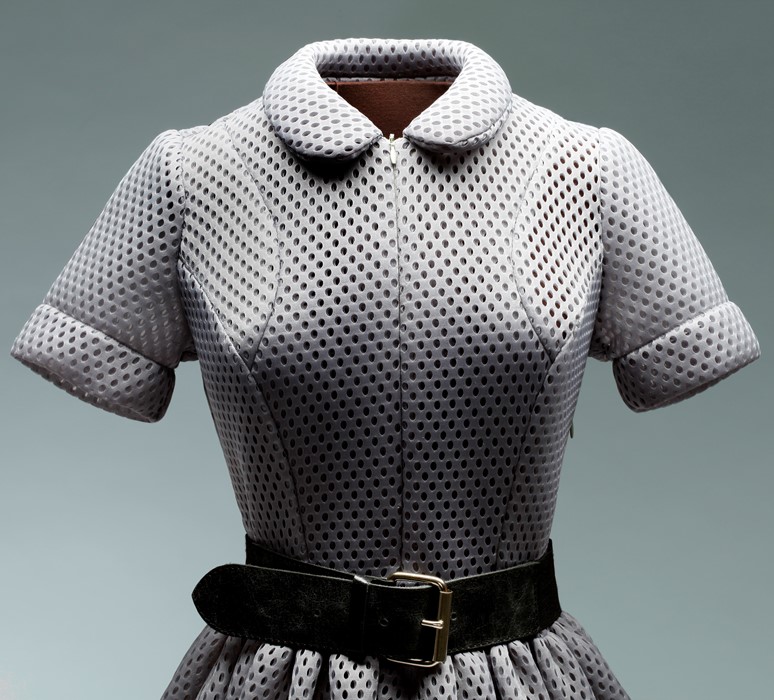 Šaty dámské šedé „pro BB“, Monika Drápalová pro Free Circle, polyester, 2013. Šaty jsou součástí kolekce elegantních funkčních oděvů pro městkou cyklistiku, za kterou získala Monika Drápalová na Czech Grand Design 2013 cenu designer roku. (Free Circle)