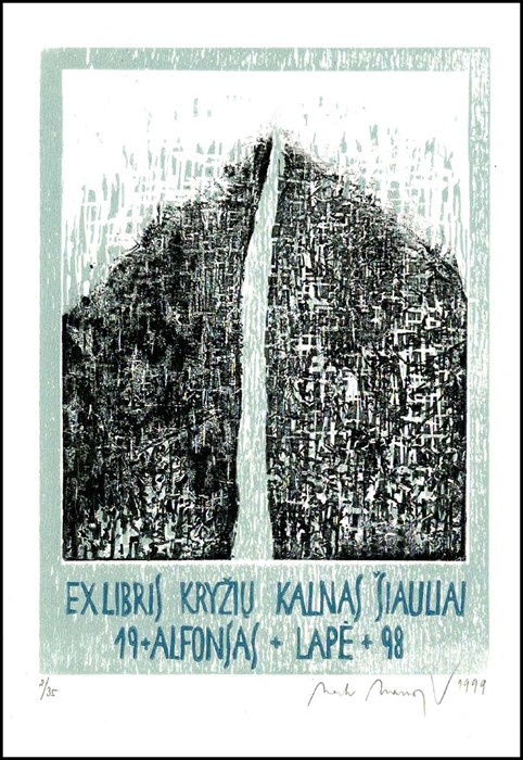 Križiu Kalnas. Tisíc křížů na hoře ve městě Šiaulai, Litva. Exlibris z roku 1999 vytvořené pro soutěž „Hora Křížů“ technikou dřevořezu a kombinovanou technikou, s užitím otisku dlaně.