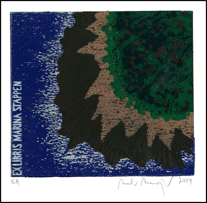 Ostrov. Exlibris z roku 2004 vytvořené pro Marinu Stappen technikou dřevořezu a kombinovanou technikou.