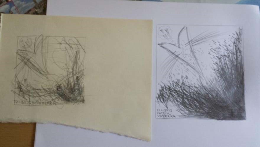 Proces vzniku exlibris začíná skicou (vlevo) a výsledným návrhem exlibris (vpravo). Před zahájením práce si grafik rozvrhne celkovou kompozici, rozhodne o materiálu, počtu barev a pořadí, v jakém budou matrice otiskovány.