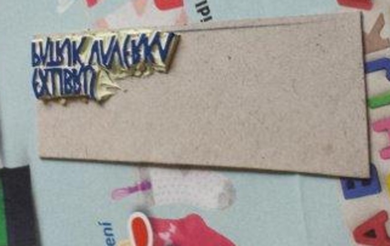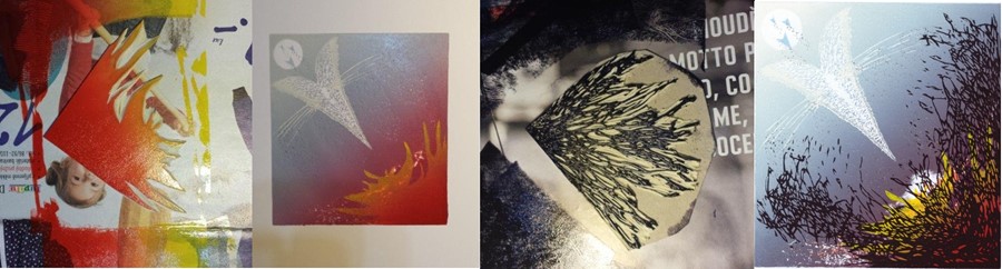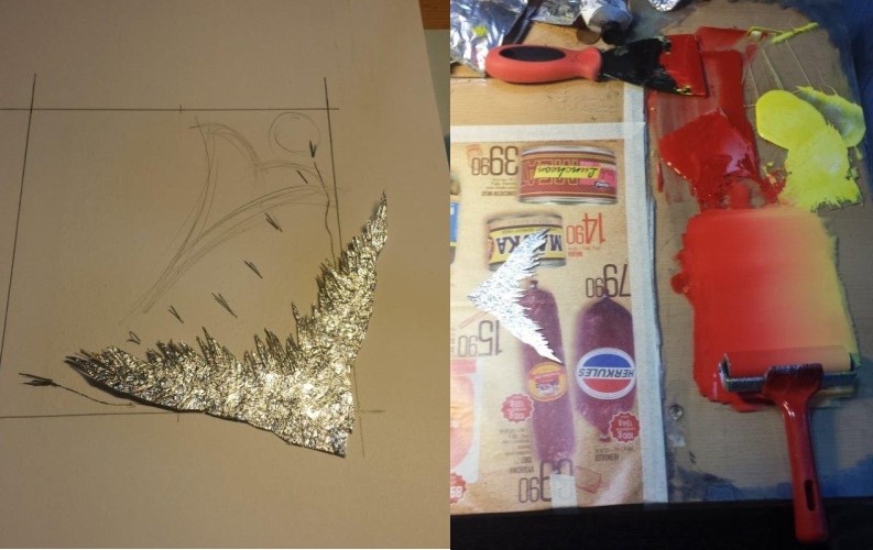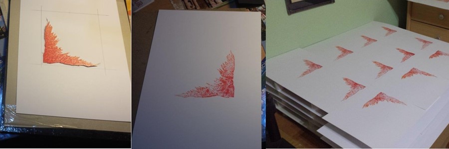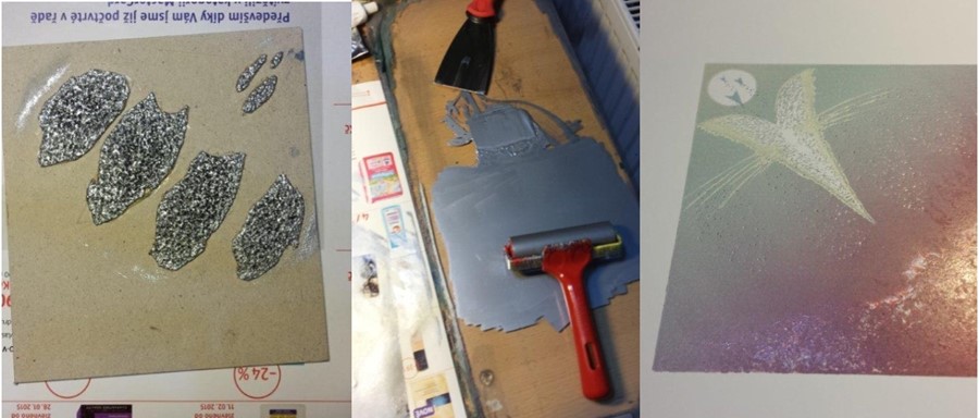 K tisku motivu v pravém dolním roku je použita matrice připravená z fixované a tvarované aluminiové folie. V pravé části obrázku vidíte přípravu pro tzv. irisový tisk, tedy tisk s přechodem barev.
