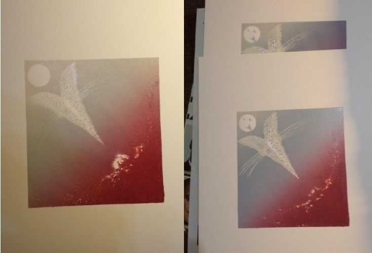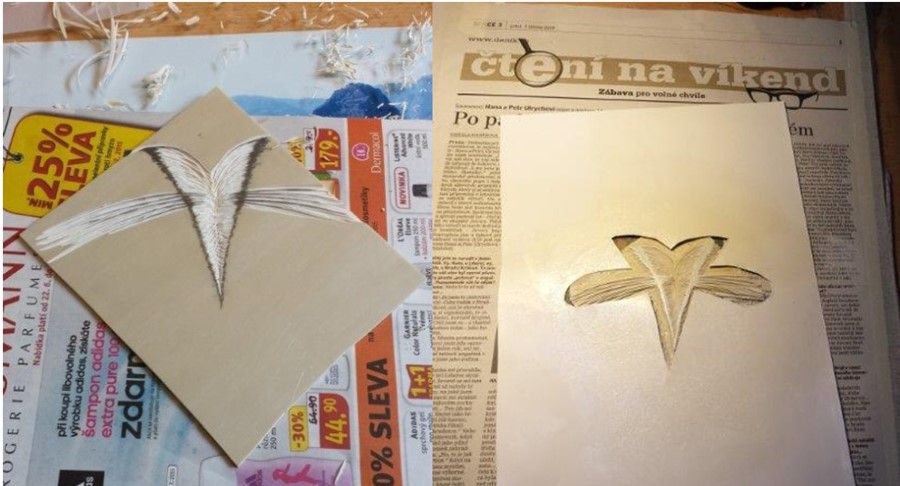Matrice vlevo na obrázku je vytvořena z hrubého smirkového papíru, který vytvoří ve výsledné grafice neobvyklé struktury (vpravo).