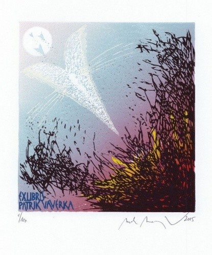 Výsledná podoba exlibris pro Patrika Váverku s názvem „Věčný boj dobra a zla“. Jedenáctibarevný linoryt z roku 2015, tisková plocha 130 x 120 mm na papíře velikosti A4.