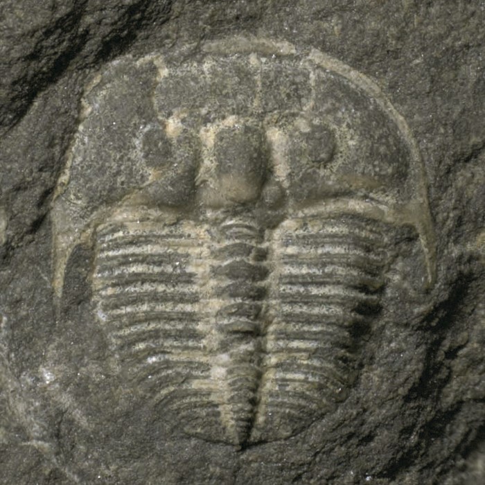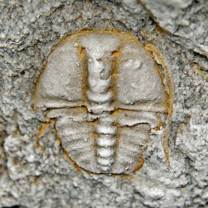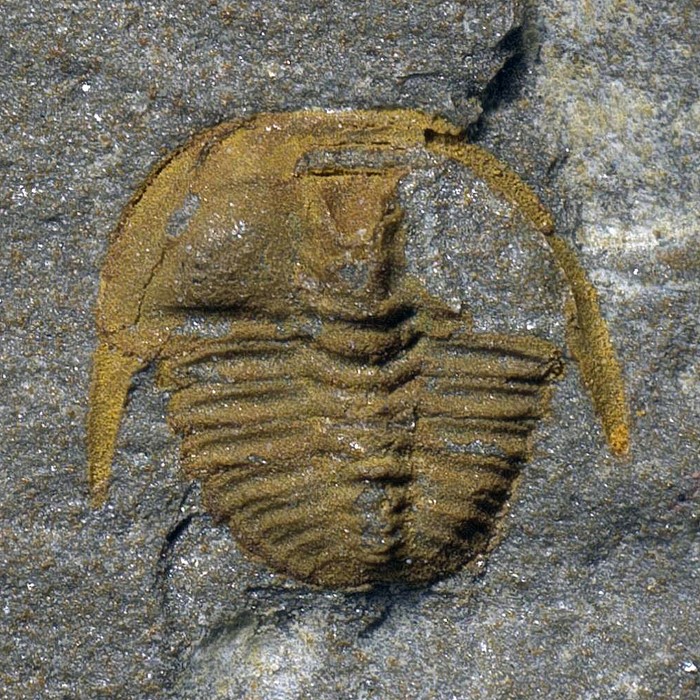 Rané vývojové (meraspidní) stádium trilobita druhu Aulacopleura konincki. Jedinec je dlouhý asi 2,5 mm a pochází ze silurských hornin v okolí obce Loděnice.