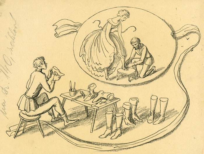 Ilustrace k pohádce Apolenčiny střevíčky. Loubalová, Joža: Hvězdný dům. Brno: Družstvo Moravského kola spisovatelů, 1947