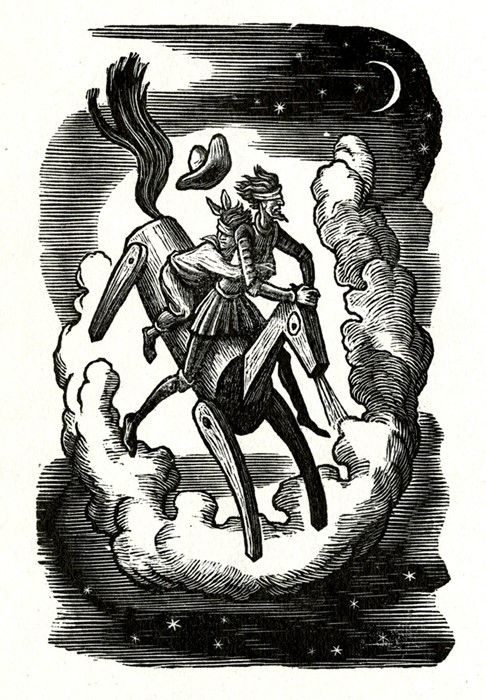 Grafický list z cyklu Don Quijote. Novotisk tištěný z původního dřevorytového štočku z roku 1941. Cyklus vydal u příležitosti 100. výročí narození Petra Dillingera v roce 1999 Ivan Dillinger v padesáti výtiscích.