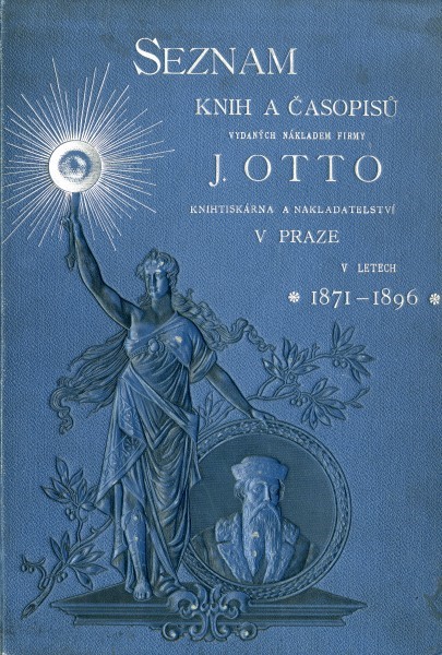 Knižní katalog nakladatelství Jana Otty z roku 1896. Na obalu alegorie Osvěty, opírající se o medailon s podobiznou Johanna Gutenberga.