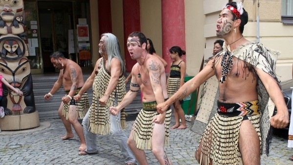 Bojový tanec haka na nádvoří Náprstkova muzea