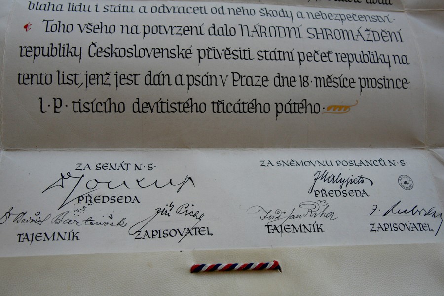 Podpisy na diplomu z roku 1935 (prezident Edvard Beneš)