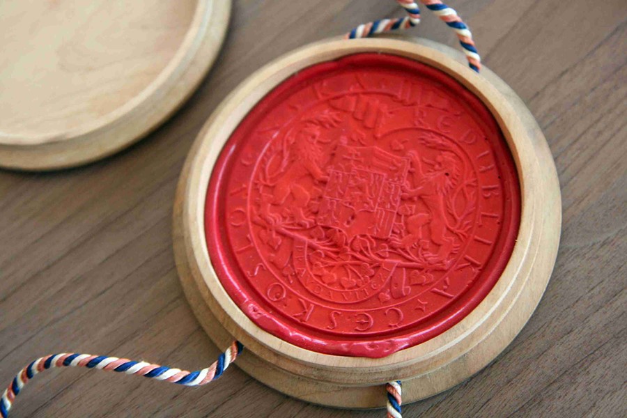 Pečeť v dřevěném pouzdře (prezident Emil Hácha)