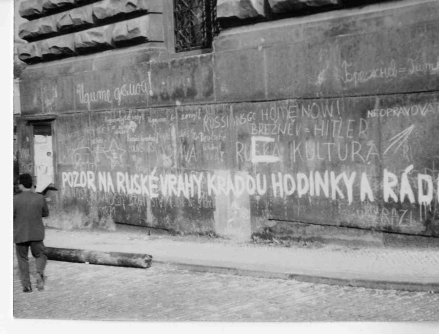Fasádu ´vyzdobili´ i pražští občané, kteří svou frustraci vyjádřili pomocí nápisů na zdech. Foto: Ksandr