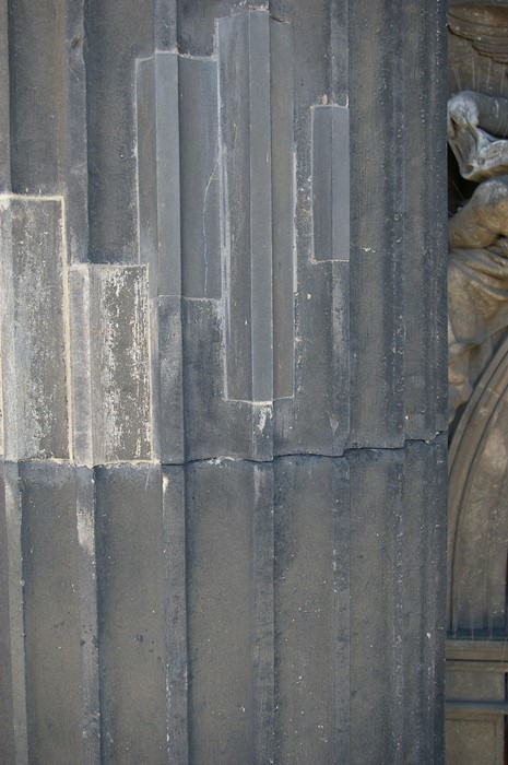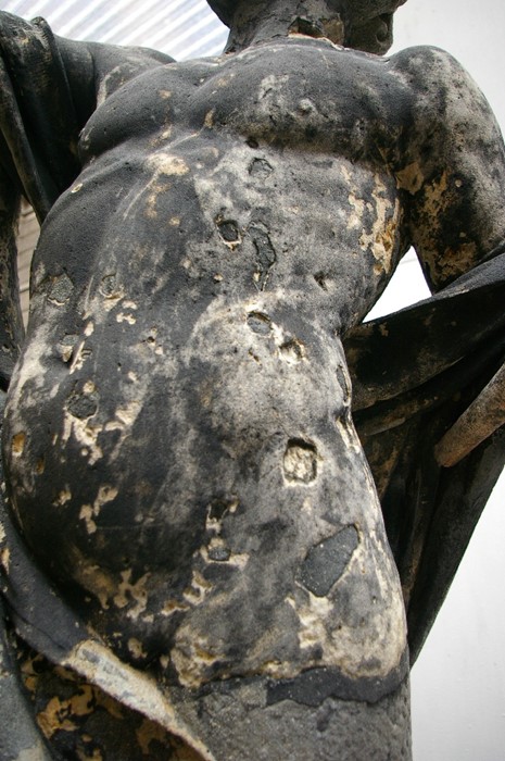 Detail střelami poničeného sousoší Géniů z průčelí budovy