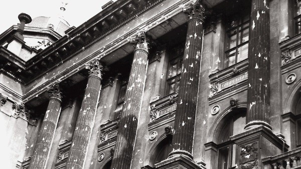 Stav hlavního průčelí po střelbě 21. srpna 1968: poškozený reliéf středního rizalitu