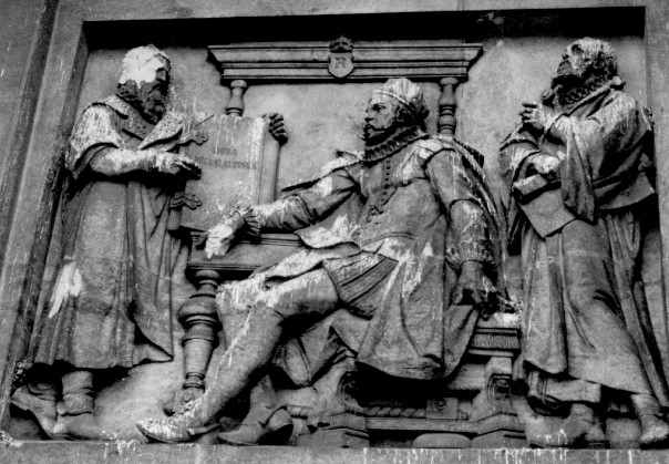 Tablo ke sjezdu pro mravní výchovu v Ženevě v r. 1921, s francouzským textem o smyslu českých dějin od Jana Herbena (s ilustracemi Františka Kysely), které kulka zasáhla symbolicky ve slově LIBÉRATION (osvobození).