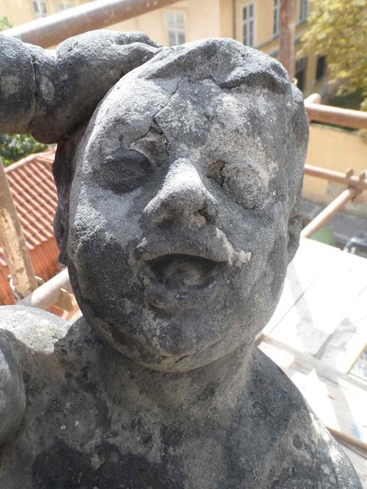 Viditelné poškození na hlavě sochy - stav před restaurováním